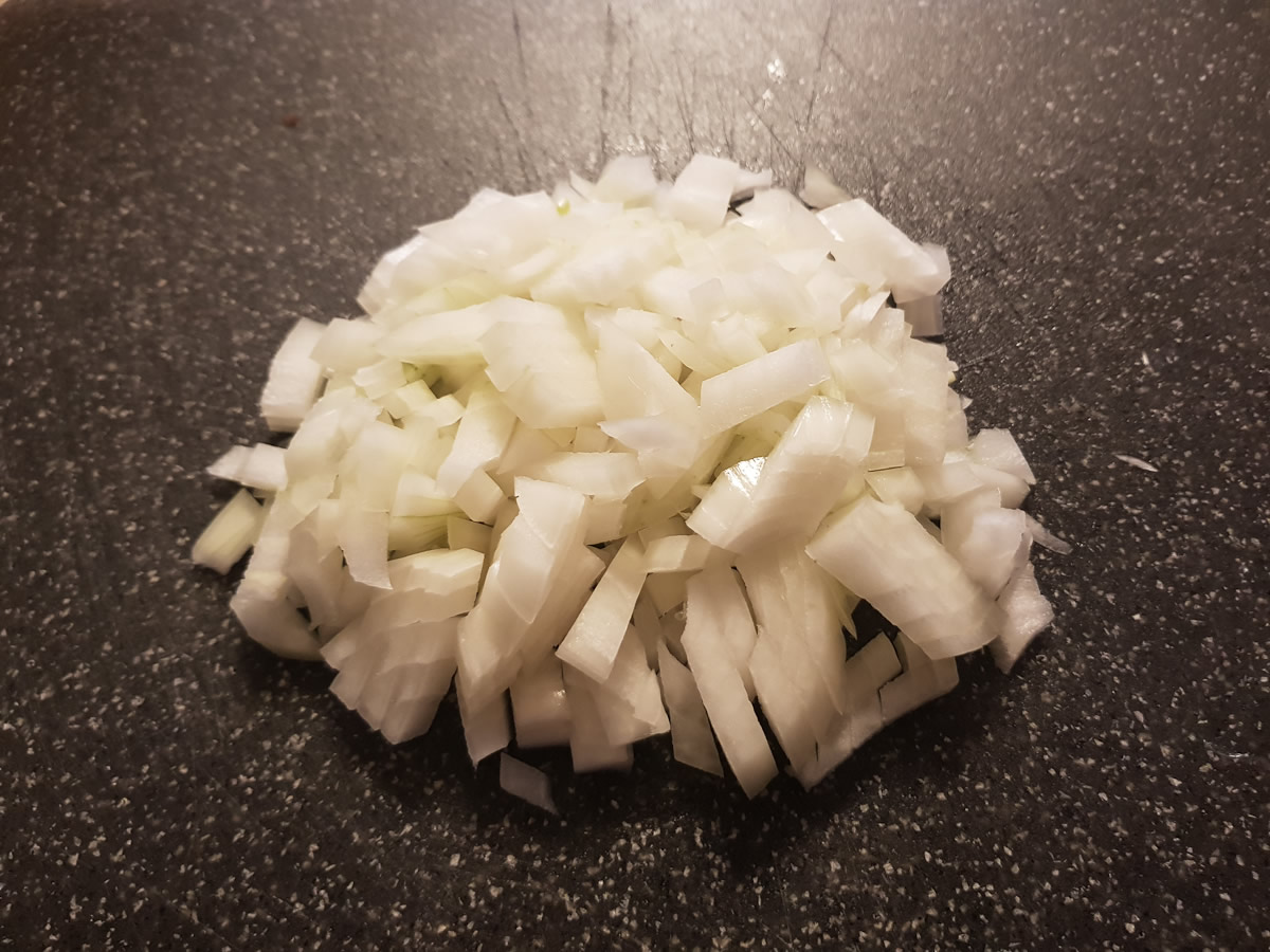 2. Die Champignons ebenfalls in dünne Scheiben schneiden. Die Zwiebel in Würfel schneiden.