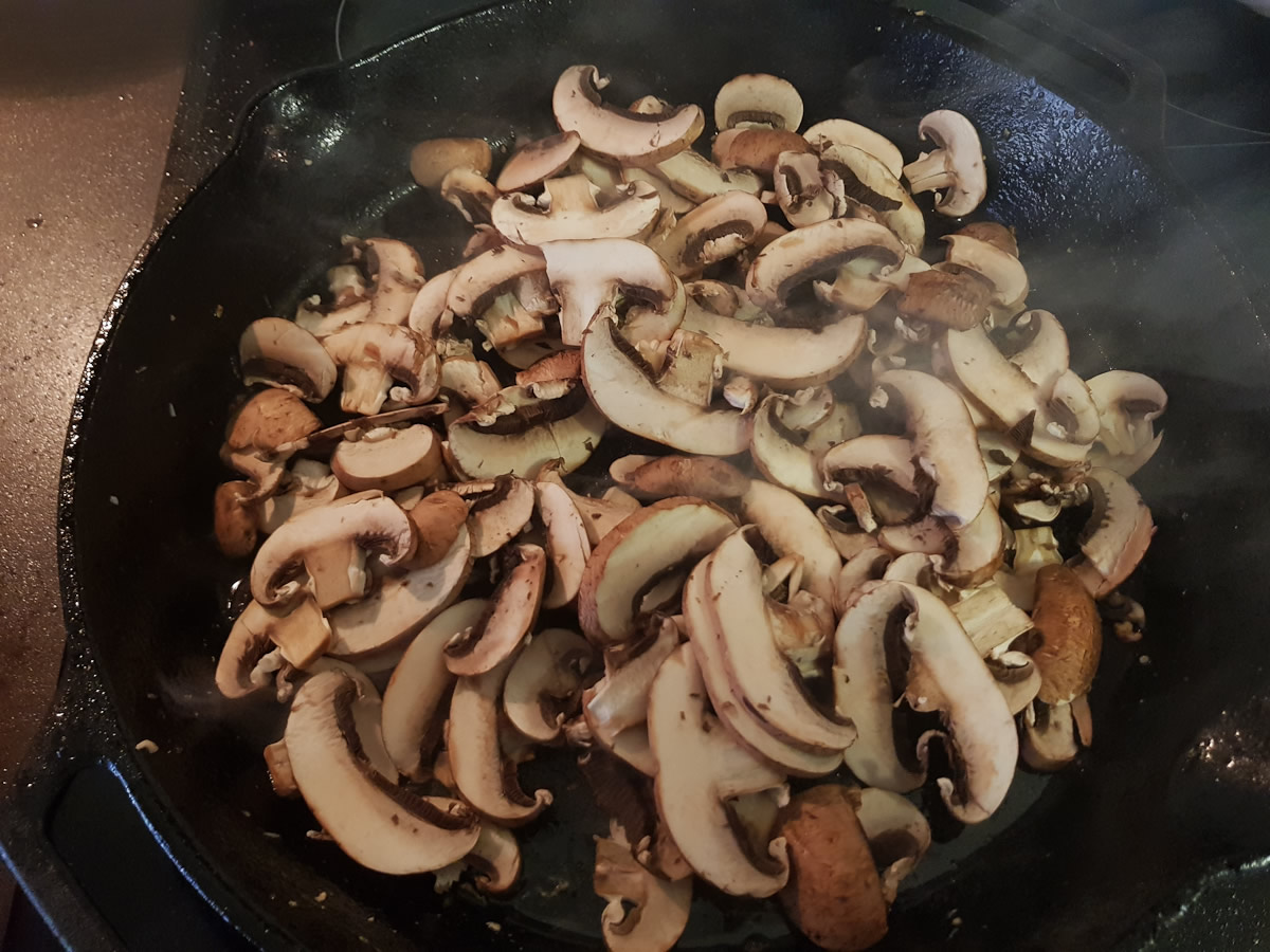 4. Im verbliebenen Öl die Champignons anbraten, mit Paprikapulver bestäuben und weiter braten, bis sie etwas Farbe genommen haben.