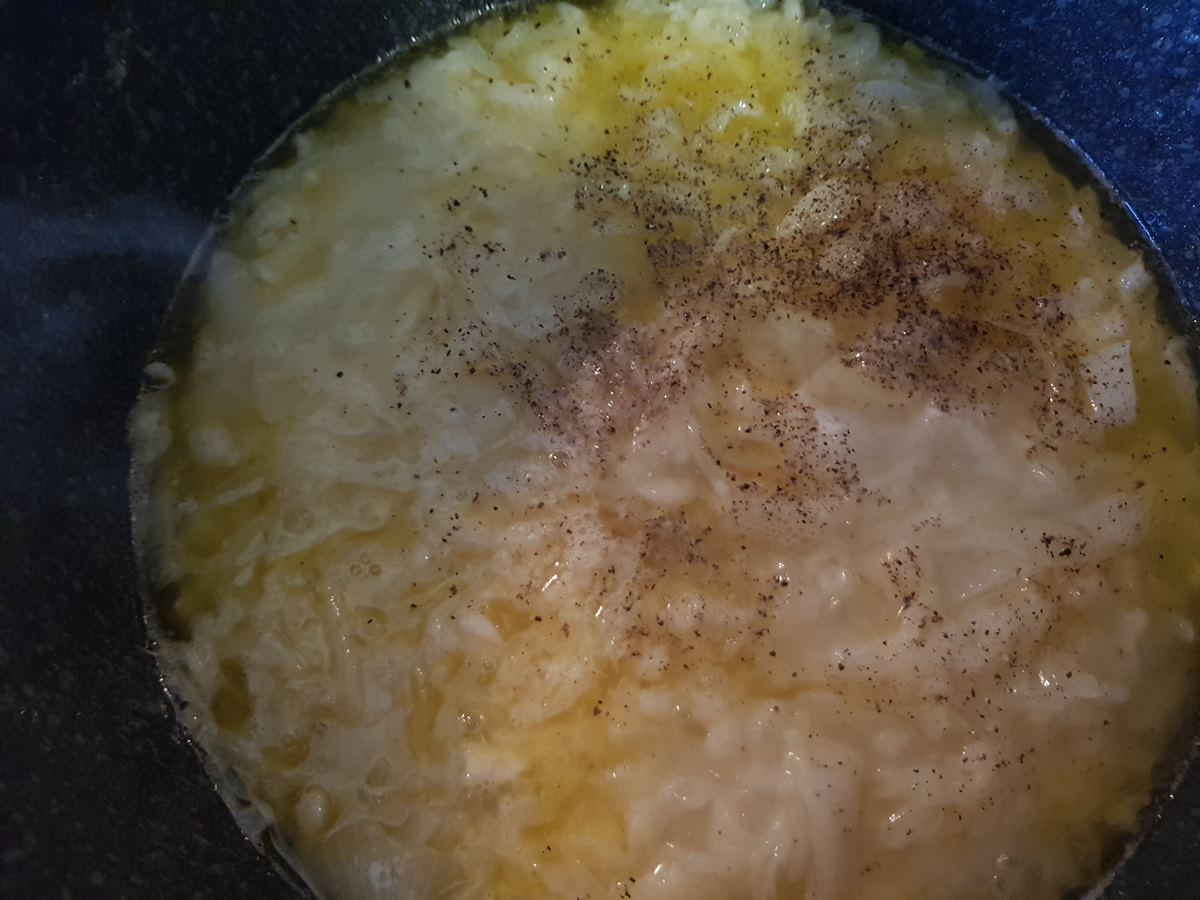 Die Butter in einem Topf erhitzen und die Zwiebelringe darin ca.12 bis 15 Minuten andünsten. Die Zwiebelringe dürfen ruhig etwas braun werden, müssen aber nicht.