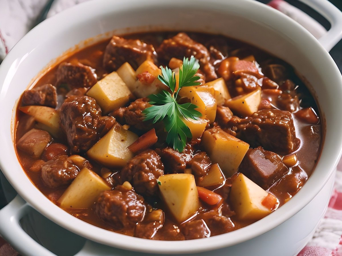Stellen Sie einen großen, schweren Topf auf den Herd. Braten Sie nun die Rindfleischwürfel im Butterschmalz 5 Minuten von allen Seiten an.