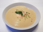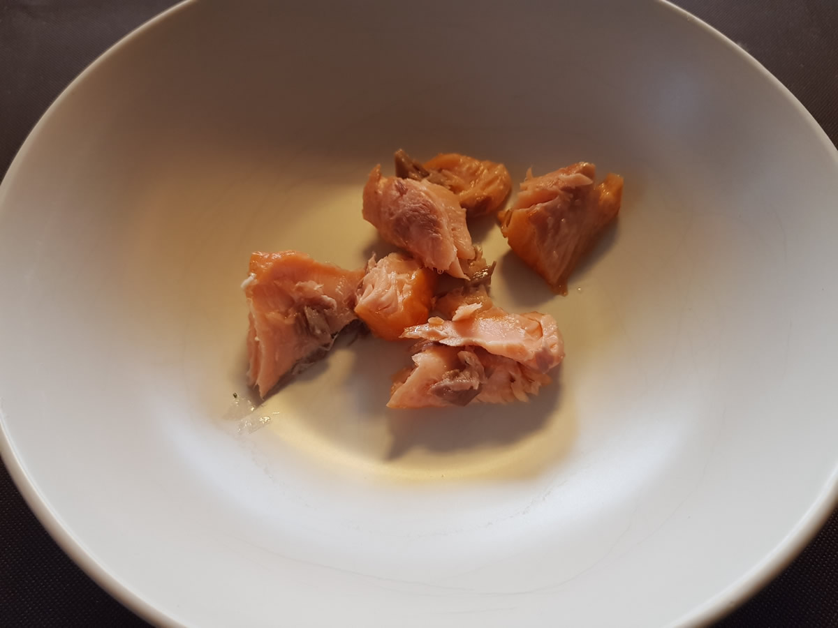 5. Den Stremellachs vorsichtig in kleine Stücke schneiden bzw. reißen, dann in vorgewärmte Suppenteller geben und mit der Suppe begießen.