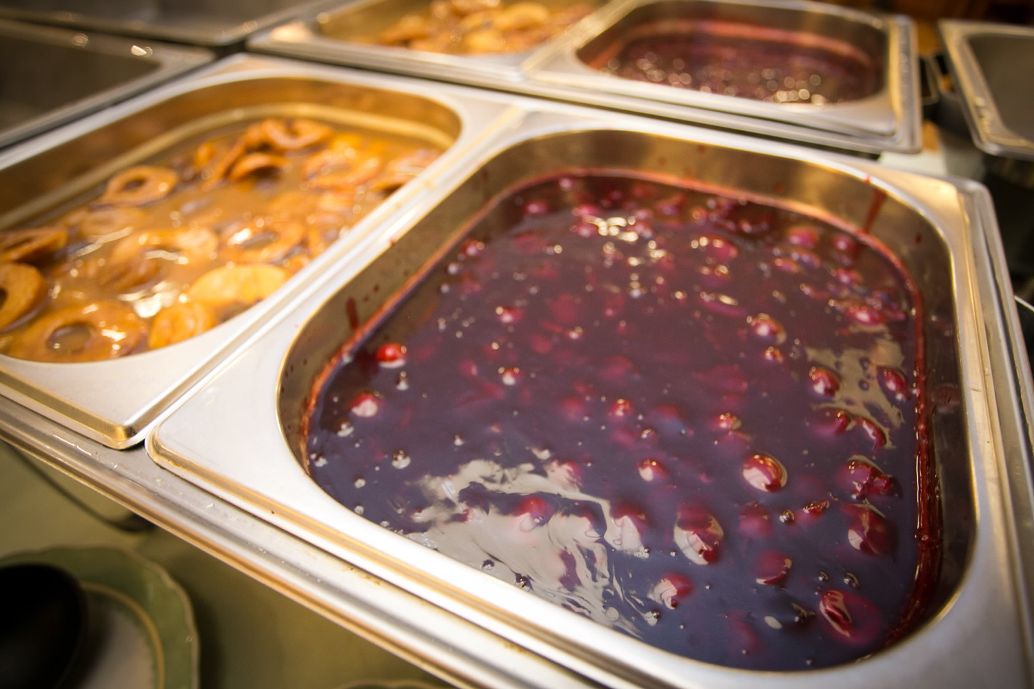 Es wurde serviert: Mehlbeutel mit Kasseler vom Schweinenacken, Kochwurst, Schweinebacke, Honig-Backobstsauce und Kirschsauce.