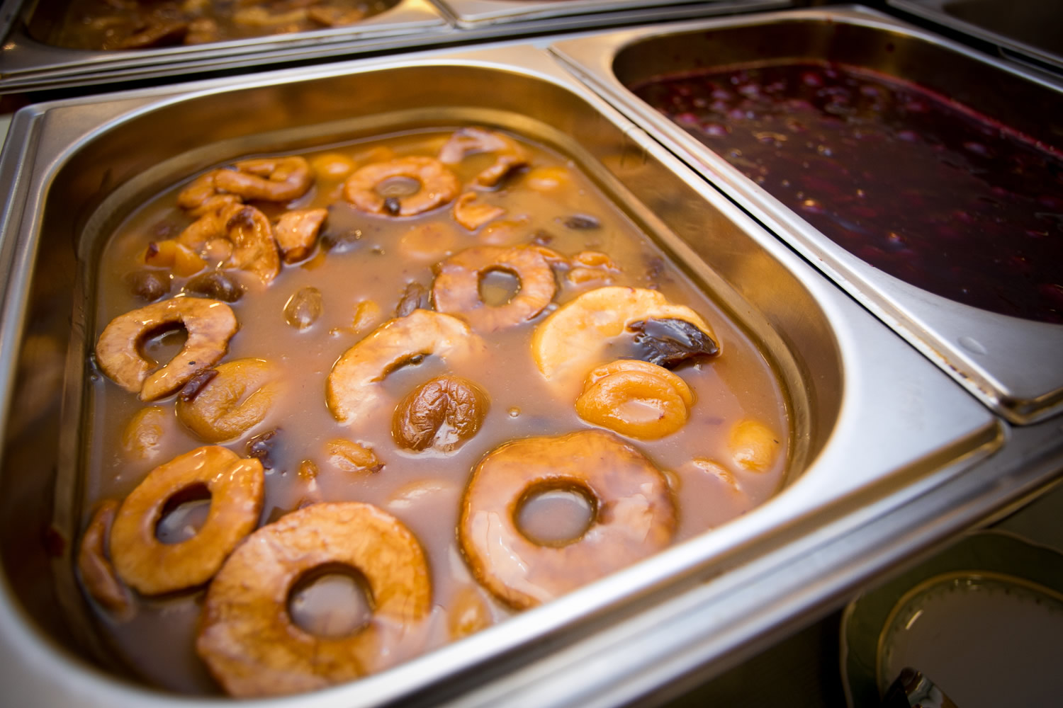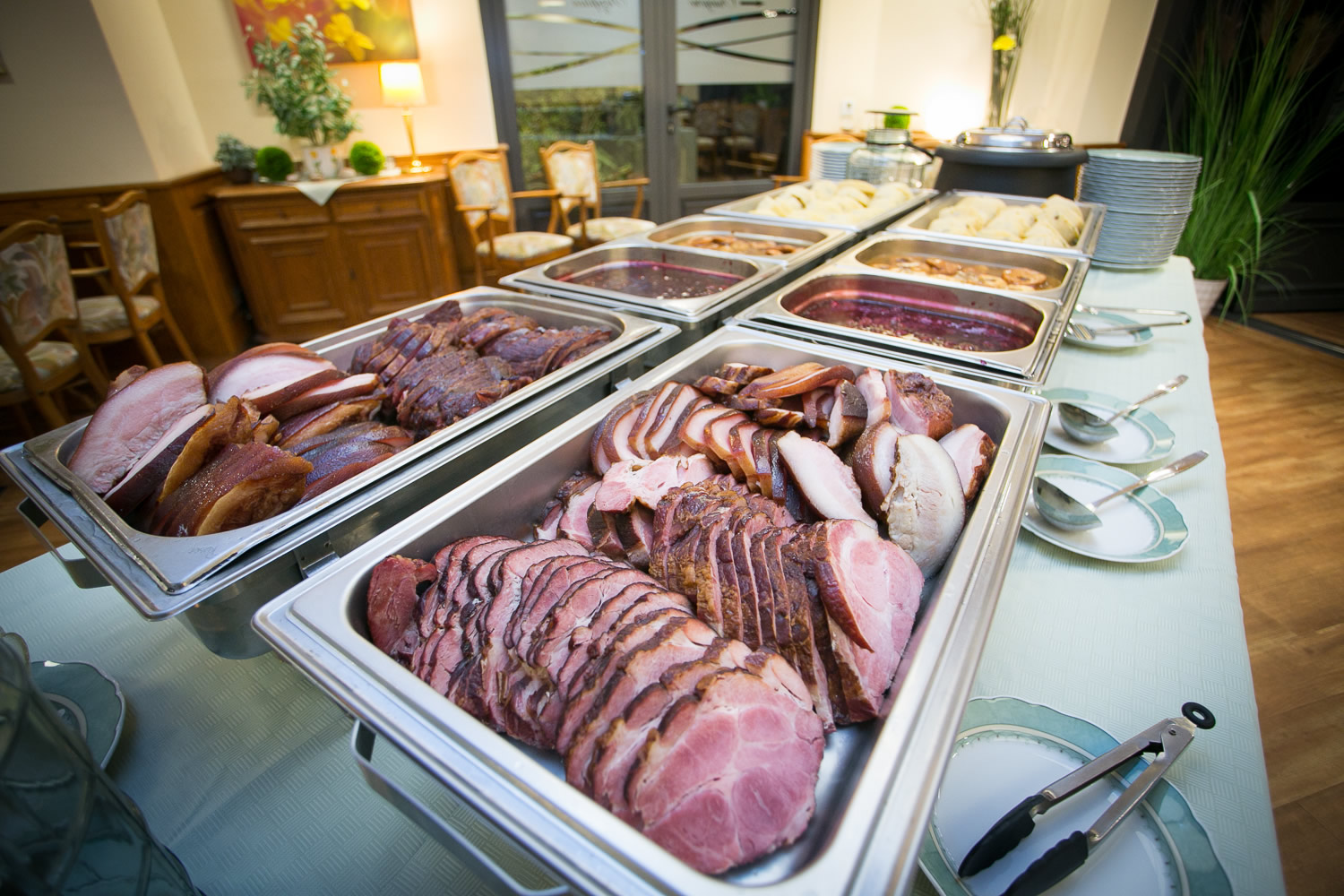 Es wurde serviert: Mehlbeutel mit Kasseler vom Schweinenacken, Kochwurst, Schweinebacke, Honig-Backobstsauce und Kirschsauce.